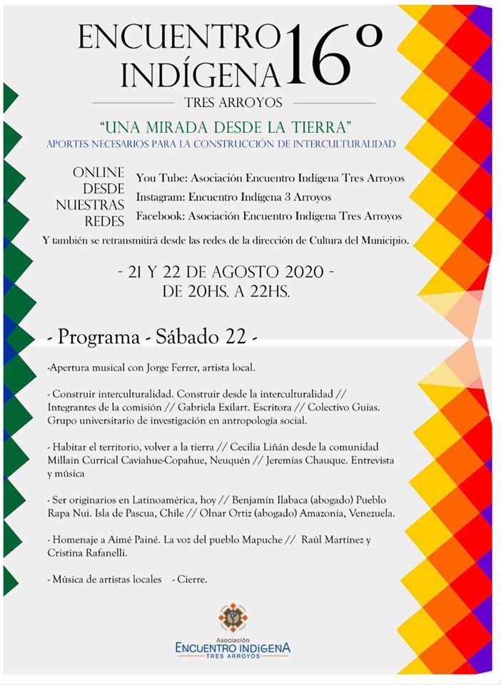El viernes 21 se realizará la apertura a cargo de los integrantes de la comisión bajo el lema “¿Por qué una mirada desde la tierra?”, donde se harán aportes necesarios para una construcción intercultural. Posteriormente se hablará sobre qué es “Ser originario en Tres Arroyos y la zona”, a cargo de Rocío Saihueque (Mapuche de Tres Arroyos), Ricardo Curruinca (Mapuche de Tres Arroyos) y María Isabel Millaqueo (Mapuche de Coronel Dorrego).