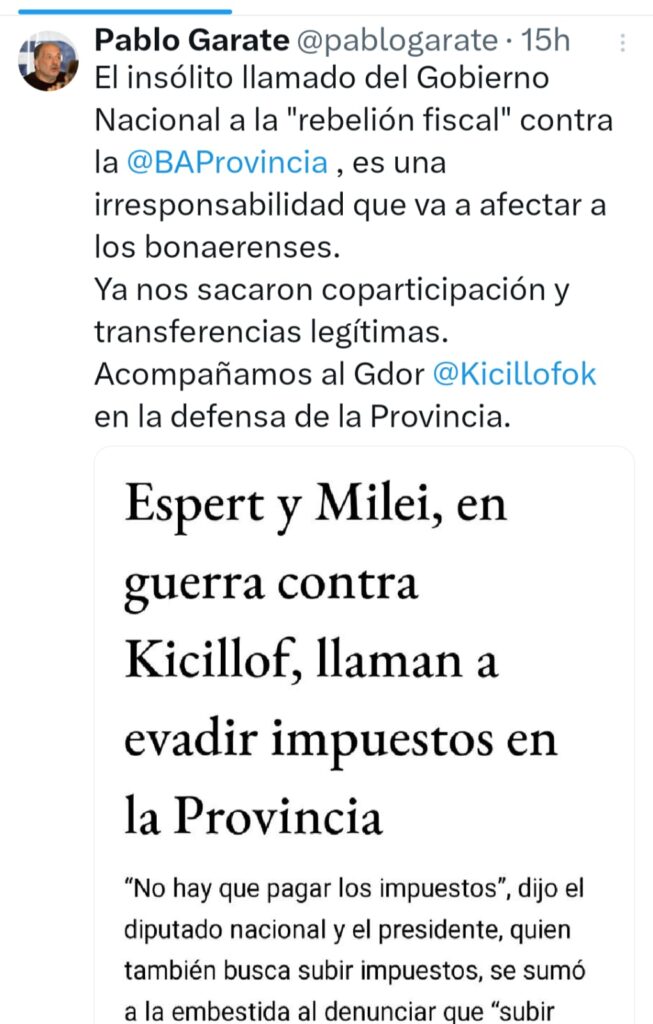 En su publicación, Garate destaca que, además de las ya existentes pérdidas de coparticipación y transferencias legítimas, estas expresiones del diputado Luis Espert (LLA) primero y del Presidente Javier Milei, después, son peligrosas y contraproducentes, ya que promueve una situación de incumplimiento tributario que podría tener consecuencias negativas para todos los ciudadanos y para la estabilidad fiscal de la provincia.