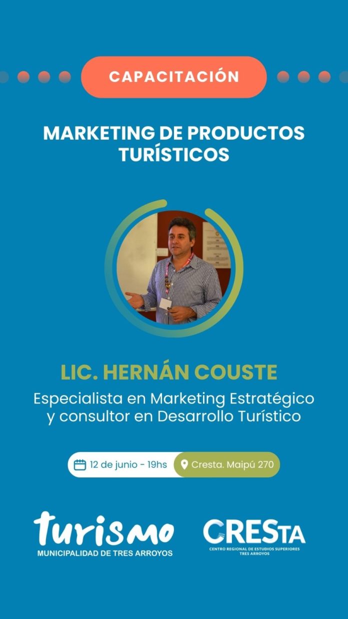 El próximo miércoles se llevará a cabo la primera capacitación del Ciclo de charlas de Turismo y Desarrollo, organizado por la Dirección Municipal de Turismo. En esta oportunidad, el Licenciado Hernán Couste, especialista en marketing estratégico y consultor en desarrollo turístico, brindará una capacitación en Marketing de Productos Turísticos, dirigida a emprendedores, prestadores de servicio, estudiantes y todo el público interesado que esté de alguna manera vinculado a la actividad turística, de esta manera potenciamos a nuestro distrito entendiendo y ampliando la oferta para todo el año.