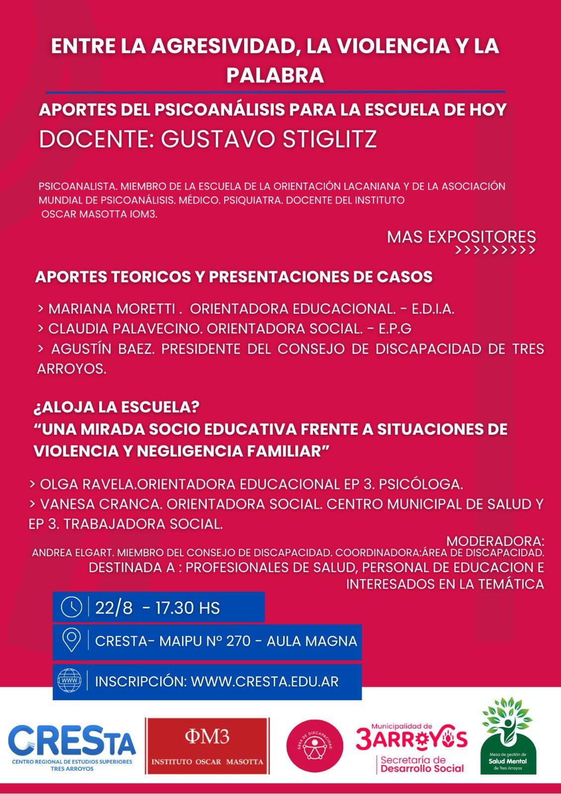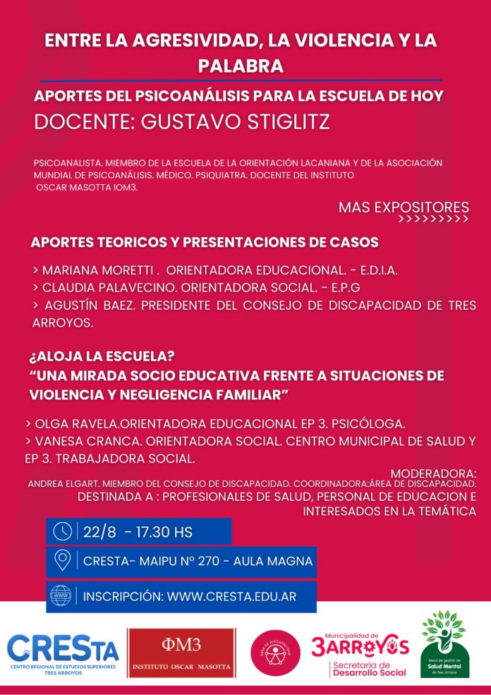 El encuentro se realizará el viernes 22 de agosto, a las 17:30 horas, en el aula magna de CRESTA (Maipú 270), con el objetivo de generar un espacio de diálogo interdisciplinario que permita pensar estrategias para alojar, contener y acompañar situaciones complejas en el ámbito escolar.