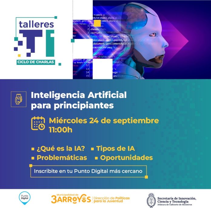 El Punto Digital de la Dirección de Políticas para la Juventud informa que se encuentra abierta la convocatoria para participar del taller “Inteligencia Artifical para principiantes” el Miércoles 24 de Septiembre a las 11:00 hs en Brandsen 181. En el mismo se tratará: qué es la IA, tipos, problemáticas y oportunidades.
