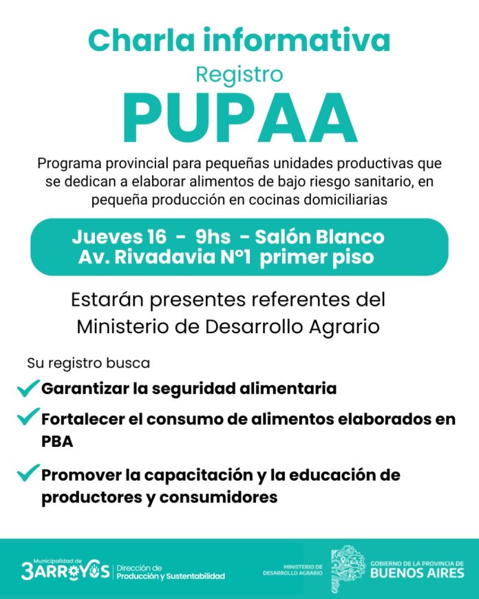 El jueves 16 a las 9 hs, en el Salón Blanco del Palacio Municipal, se realizará una reunión con el responsable del Programa PUPAA (Programa Provincial para Pequeñas Unidades Productivas de Alimentos Artesanales) del Ministerio de Desarrollo Agrario, donde se explicarán las herramientas disponibles para acompañar y potenciar sus proyectos.