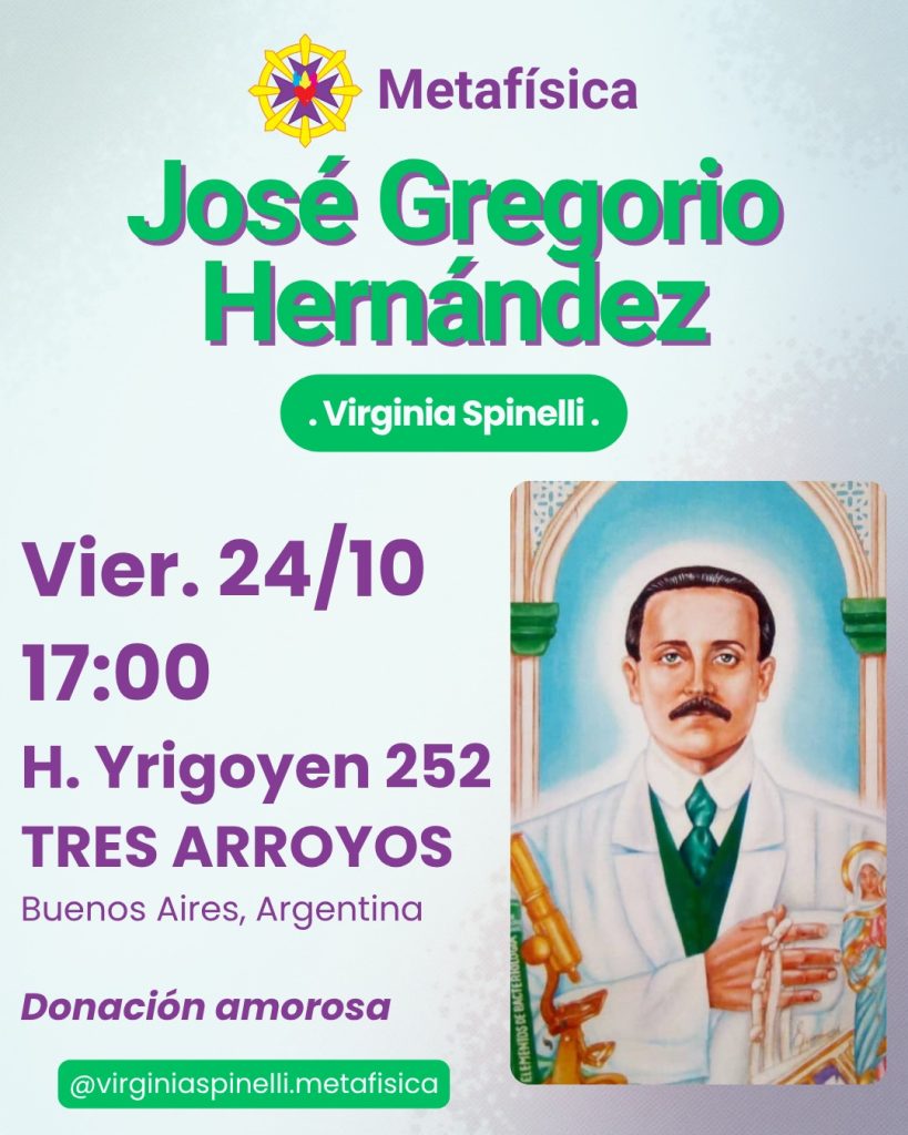 El grupo de Metafísica Ts. as. coordinado por Virginia Spinelli se reúne el viernes 24 de octubre a las 17 hs. para compartir una charla sobre José Gregorio Hernández. La entrada es libre y gratuita. Se solicita una donación amorosa voluntaria.
