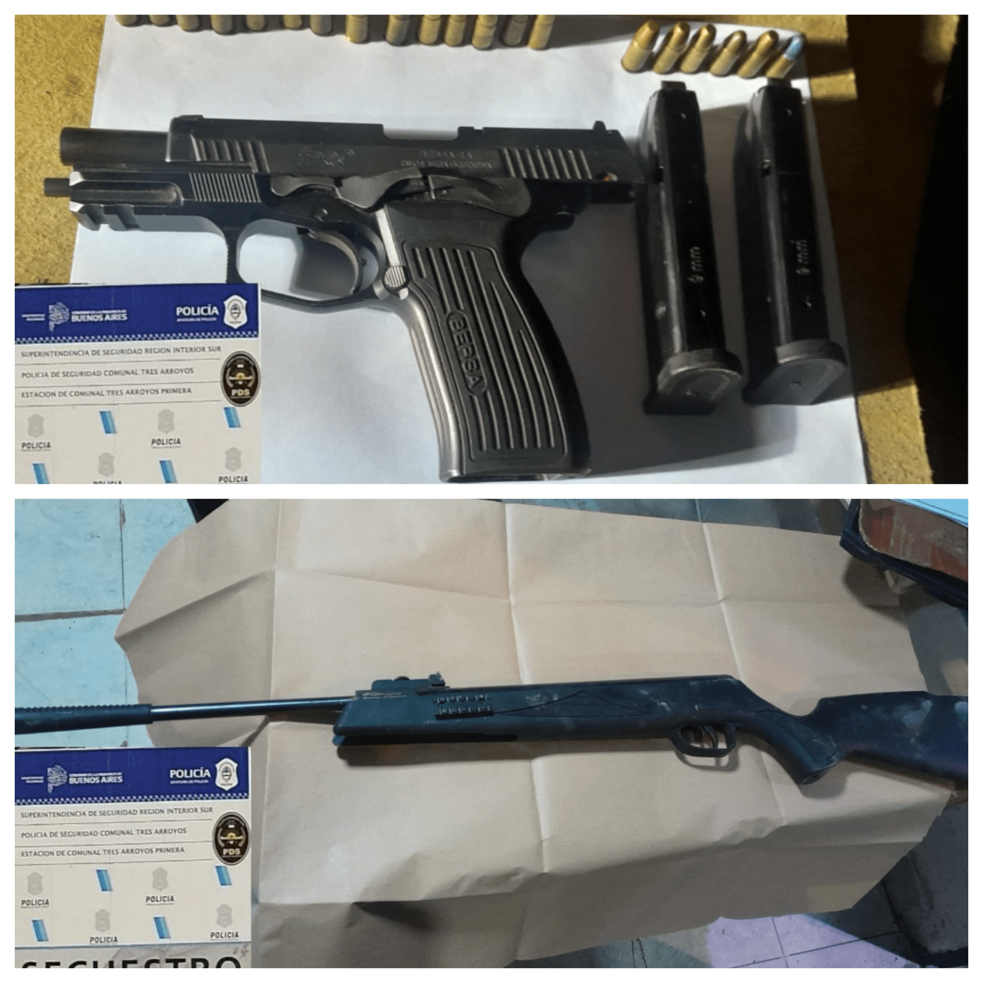 Durante el procedimiento —en el que participaron efectivos del Escuadrón de Caballería, la SubDDI, Policía Científica y el instructor judicial Dr. Iparraguirre— se incautaron una carabina de aire comprimido calibre 5.5 mm, una pistola Bersa Thunder calibre 9 mm con 20 municiones, y el DVR de cámaras de seguridad del domicilio.