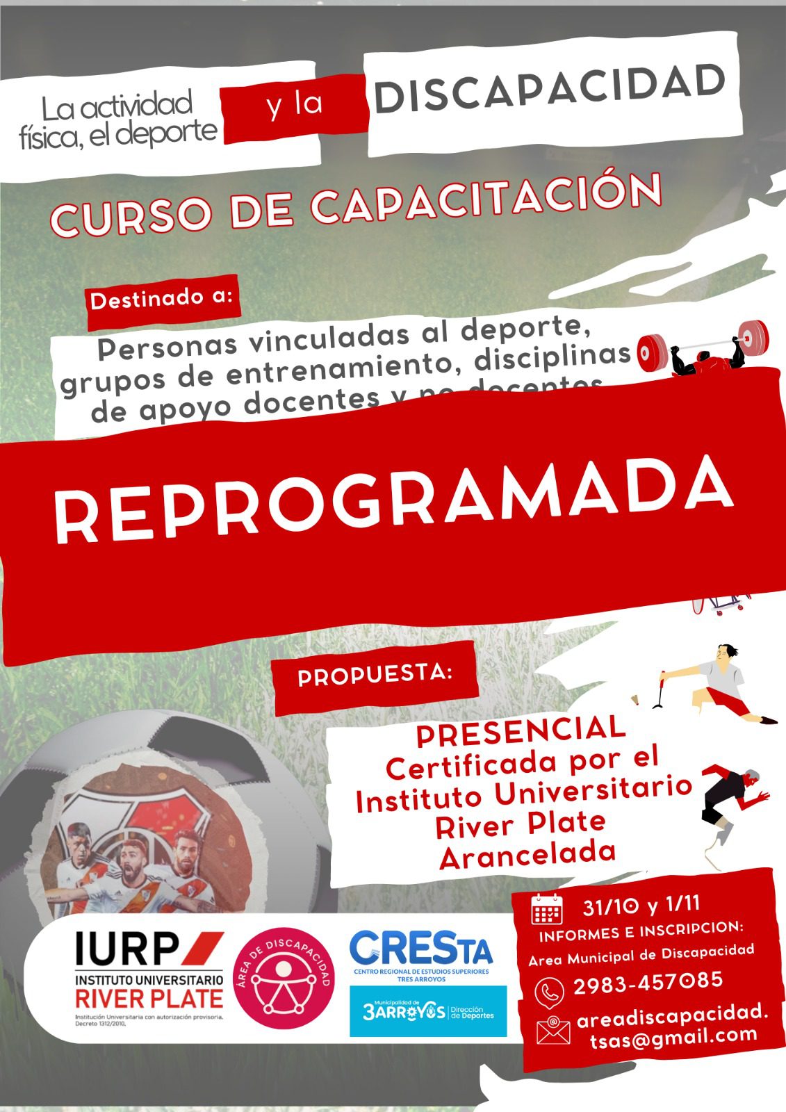 Debido a razones ajenas a la organización se reprogramará la capacitación “La Actividad Física, el Deporte y la Discapacidad”. Sin embargo se abrirá un registro de interesados para cursar la propuesta el año próximo, ya que incluía temáticas actuales como el Diseño Universal de Aprendizaje (DUA), las neurodivergencias, los ajustes razonables y el paradigma social de la discapacidad, promoviendo la construcción de entornos accesibles y estará a cargo de Pablo Dante Marín, Magíster en Educación por la Universidad Nacional de Avellaneda, reconocido capacitador y docente en inclusión y accesibilidad educativa. Con una destacada trayectoria nacional e internacional, Marín fue Coordinador del Área de Discapacidad de la Secretaría de Deportes de la Nación, impulsando experiencias pioneras de participación inclusiva en los Juegos Deportivos Escolares y los Juegos Evita.
