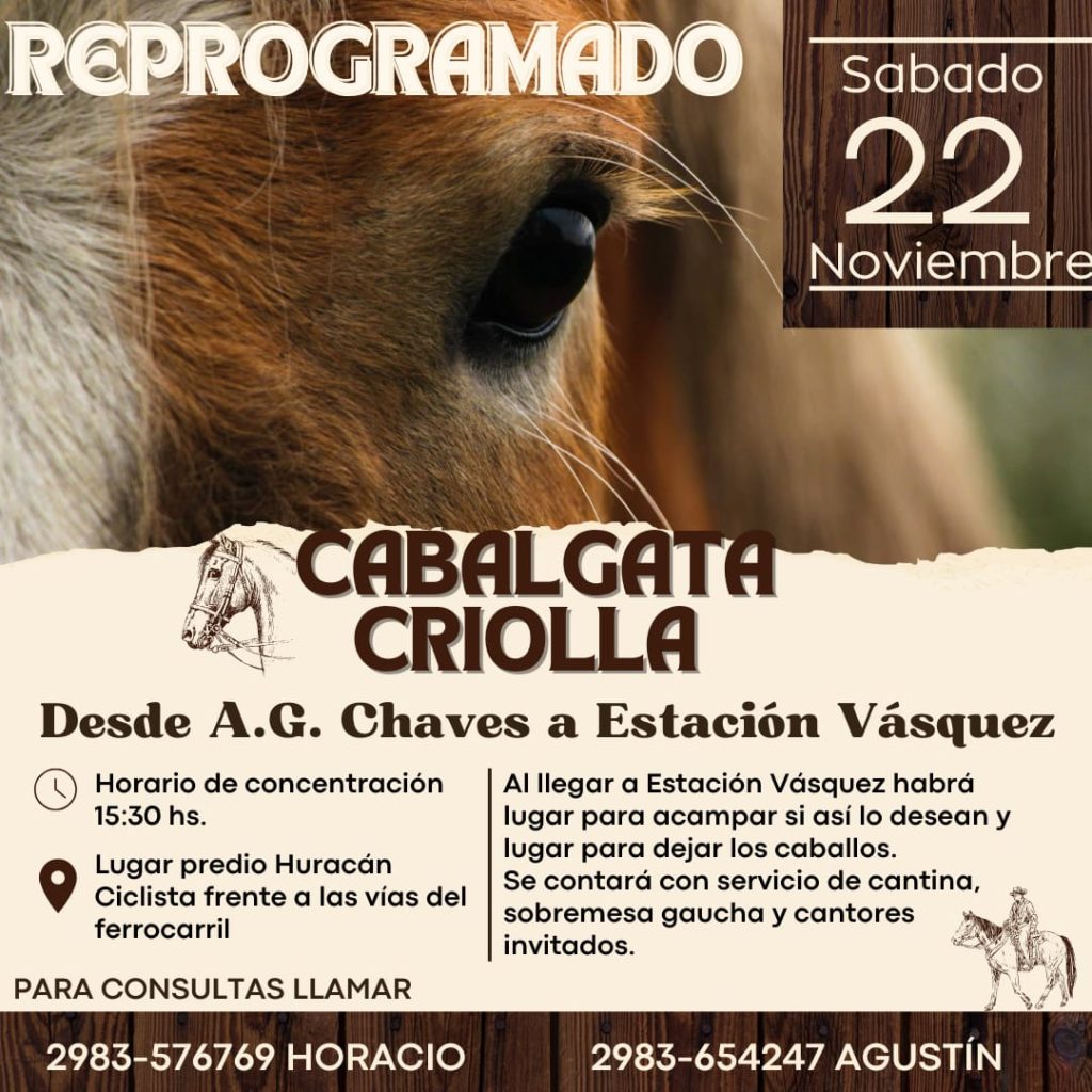 La tradicional Cabalgata Criolla que une distintos puntos de la región con Estación Vásquez fue reprogramada y finalmente se realizará este sábado 22 de noviembre, según anunciaron los organizadores.