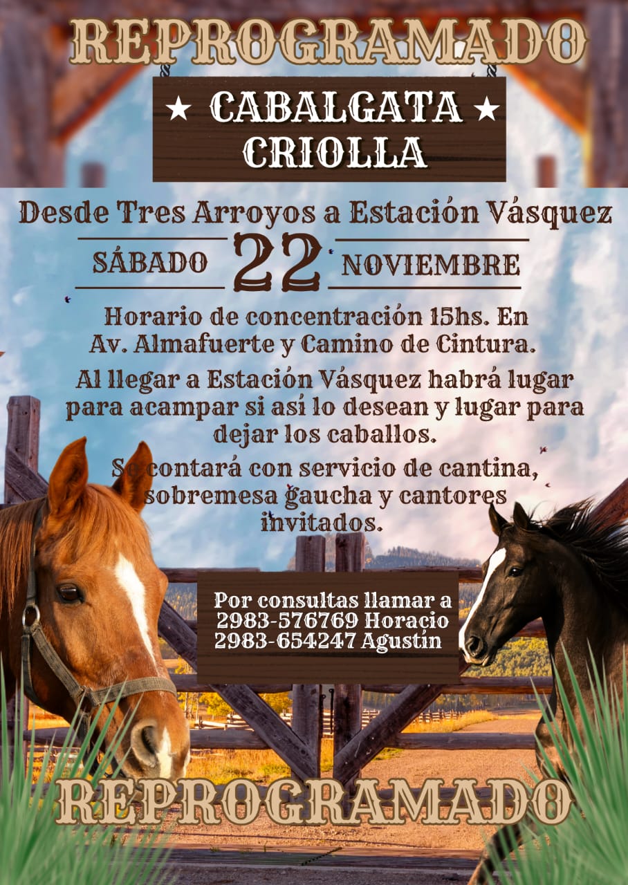 La tradicional Cabalgata Criolla que une distintos puntos de la región con Estación Vásquez fue reprogramada y finalmente se realizará este sábado 22 de noviembre, según anunciaron los organizadores.