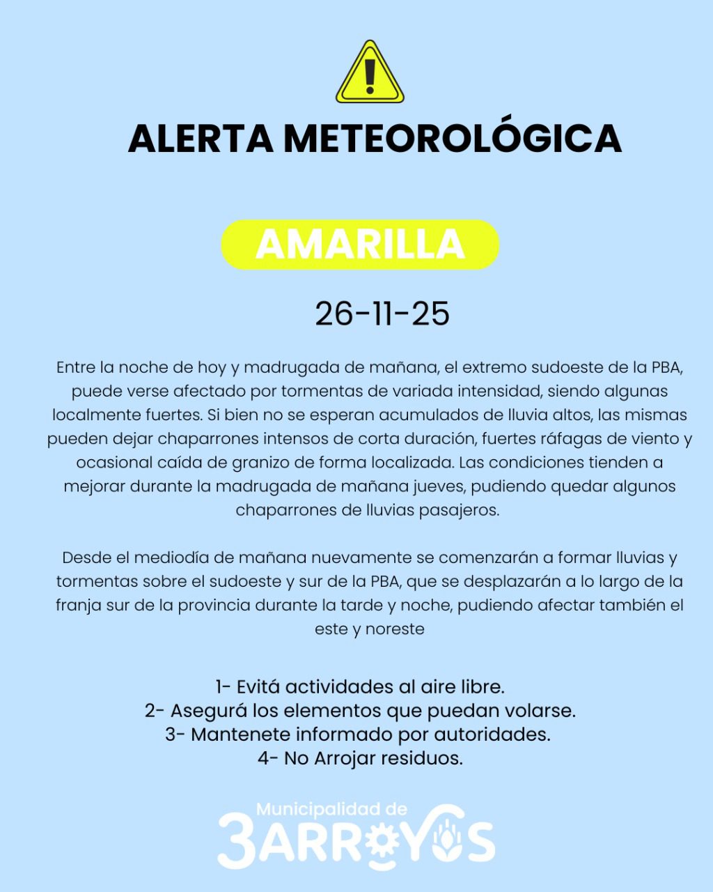 La Municipalidad de Tres Arroyos informó que el extremo sudoeste de la provincia de Buenos Aires se encuentra bajo alerta meteorológica amarilla para la noche de este miércoles y la madrugada del jueves, debido a la posible presencia de tormentas de variada intensidad, algunas de ellas localmente fuertes.