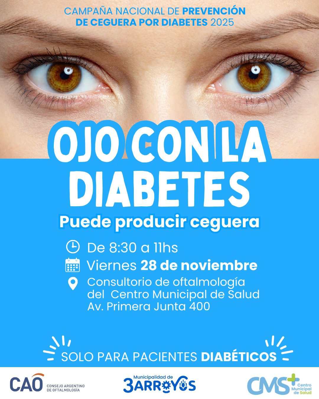 En el marco de la Campaña Nacional de Prevención de Ceguera por Diabetes 2025, el Centro Municipal de Salud invita a pacientes diabéticos a participar de un examen gratuito de fondo de ojos, que se realizará mañana viernes 28 de noviembre, de 8:30 a 11:00, en el Consultorio externo número 5 de Oftalmología, a cargo de la oftalmóloga Florencia Cavadini.