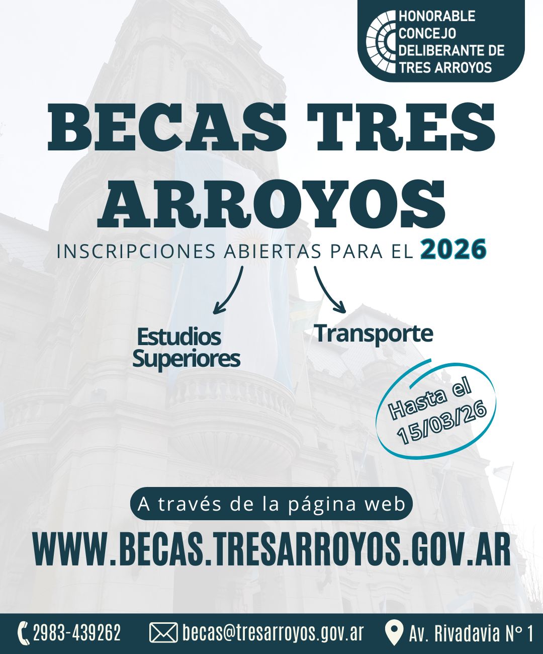 La Comisión de Becas del Honorable Concejo Deliberante informa que ya se encuentra abierta la inscripción para el programa de Becas Nivel Superior, dirigido a estudiantes de carreras terciarias, universitarias y de formación laboral dictadas dentro o fuera del Distrito de Tres Arroyos.