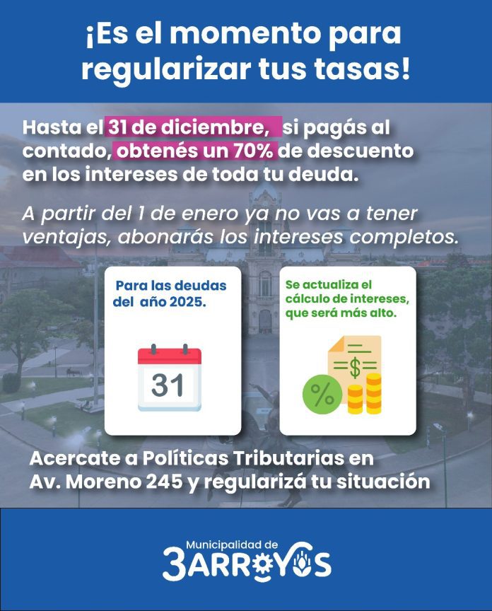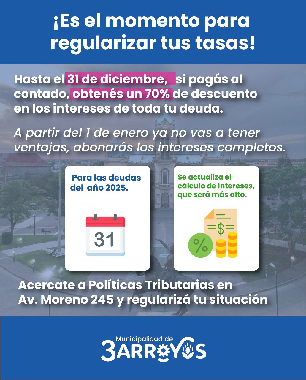 La Municipalidad de Tres Arroyos informa que, a pedido de muchos contribuyentes, se prorrogó hasta el 31 de diciembre el régimen establecido por la Ordenanza N° 7729/2025, ahora extendido mediante la Ordenanza N° 7807/2025.