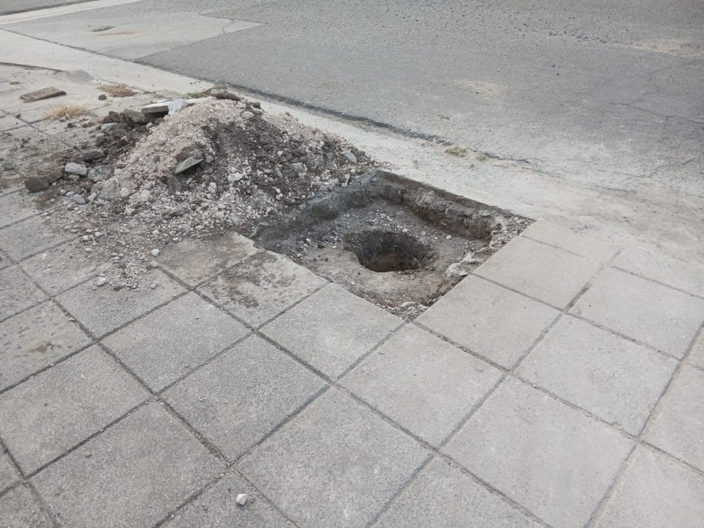 Vecinos advirtieron sobre la presencia de un pozo profundo que permanece abierto desde hace al menos dos días en la intersección de Liniers y Viamonte, presuntamente producto de trabajos realizados por una empresa de telefonía móvil e internet.