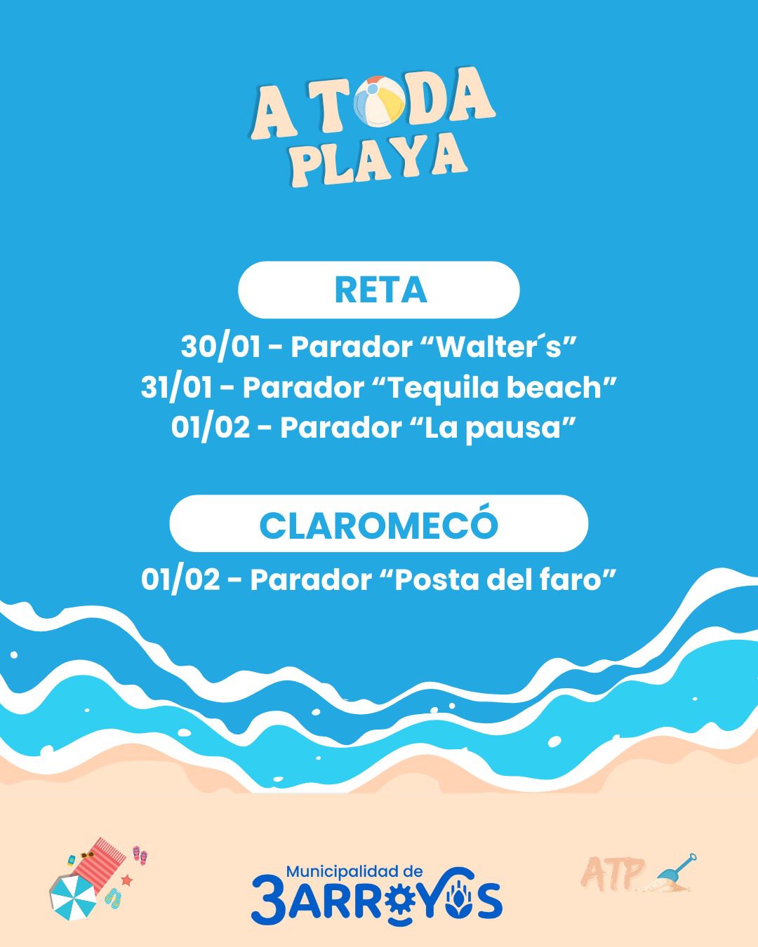 La Municipalidad de Tres Arroyos informa el cronograma del programa “A Toda Playa” previsto para este fin de semana: