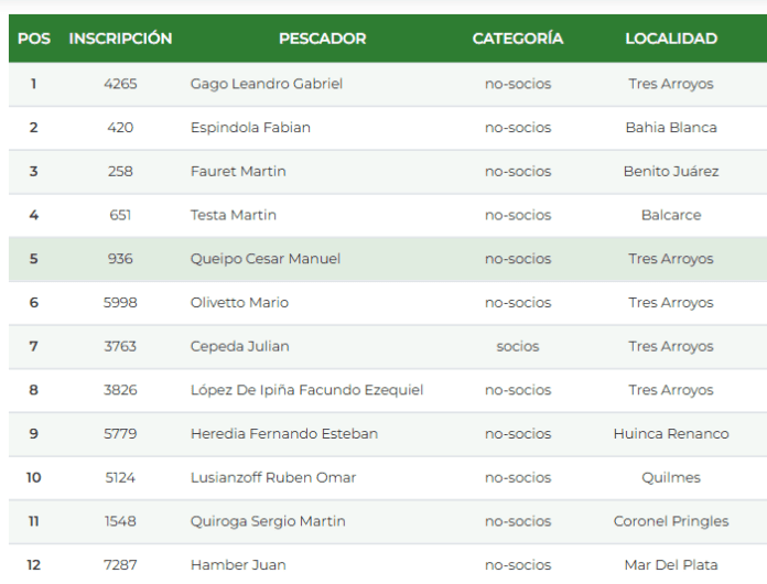 Más atrás continúan Martín Testa (Balcarce) con 2,323 kg en La Virgencita y César Manuel Queipo (Tres Arroyos) con 2,210 kg en Zaranda, en una clasificación que muestra una fuerte presencia de pescadores locales entre los primeros lugares.