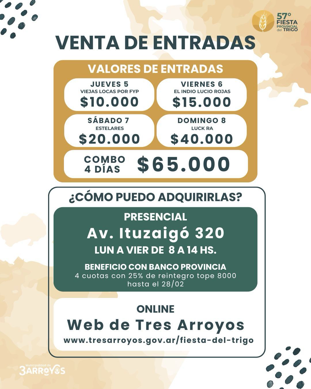 La Municipalidad de Tres Arroyos informa que mañana es el último día para aprovechar el beneficio del Banco Provincia en la compra de entradas para la Fiesta Provincial del Trigo.
