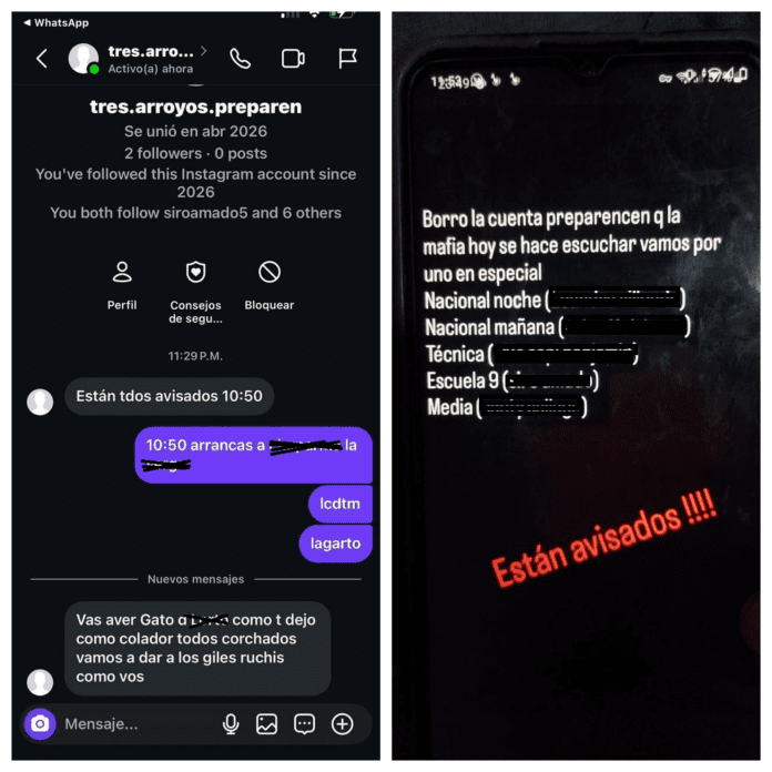 Según se pudo reconstruir, el caso tuvo su origen el jueves, cuando comenzaron a aparecer pintadas en baños de escuelas que advertían sobre posibles hechos violentos. A esto se sumó la circulación de mensajes intimidatorios a través de redes sociales, particularmente desde una cuenta de Instagram que fue difundida entre estudiantes, donde se mencionaban instituciones locales.